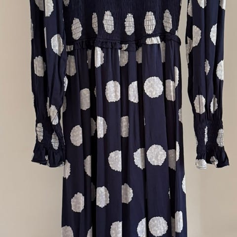 Kjolen legger seg pent rundt midje og "rynker" på ermene gjør at den sitter fint. Sort med blått bladmønster. Brukt i ett bryllup. Nypris på forretning i Harstad kr 1999,-