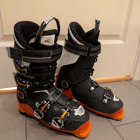 Salomon Mission alpinstøvler i svart farge. Støvlene har fire justerbare spenner i metall og powerstrap øverst for bedre tilpasning rundt leggen. Sålelengde er merket 335 mm. Egner seg til bruk med vanlige alpinbindinger i alpinbakke.