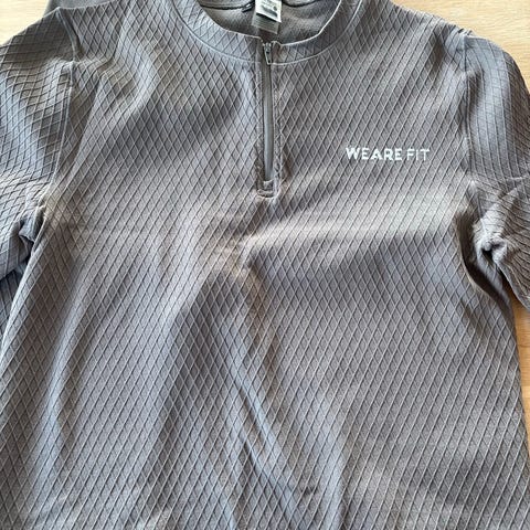 Johaug treningsoverdel for dame i størrelse M. Overdelen har halv glidelås i front og ribbestruktur i stoffet. Fargen er en dempet grønn tone. Egnet til trening og annen fysisk aktivitet. Den har en løs tråd som vist på bilde.