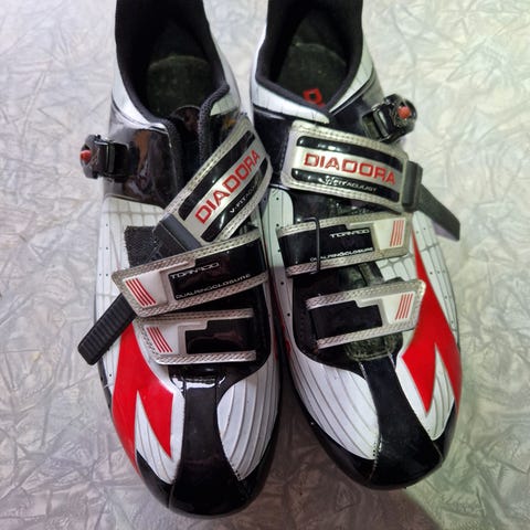 Sko kun prøvd på ikke vært i bruk. Bontrager sykkelsko i størrelse 44. Skoen er svart med røde og sølvfargede detaljer. Modellen har to borrelåsstropper og en justerbar spenne øverst for god tilpasning. Sålen har kraftig mønster for grep ved gåing og er tilpasset klikkpedaler med to-bolts innfesting (SPD-type)