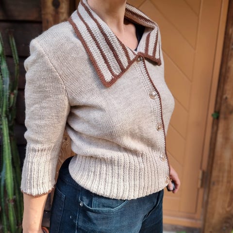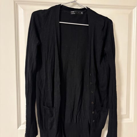 Zara cardigan for dame i størrelse, men vil si den passer bedre til S. Kort modell med korte ermer og krage. Cardiganen er brun. Lukkes med én knapp foran. Passer godt over topp eller kjole til hverdagsbruk.