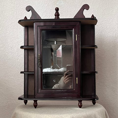 Retro sjenk/vitrineskap i malt tre selges. Skapet er solid og funksjonelt, men trenger litt oppfriskning for å bli helt fint igjen.