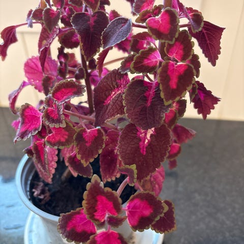 Coleus potteplante med dekorative grønne blader med røde felt i midten. Opprinnelig tatt med fra Slovenia. Planten står i plastpotte med jord. Egner seg best i vinduskarm, eller et annet sted den får jevnt med lys.