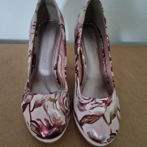 Friske, fargerike høyhæle damesko med platå i et sofistikert vårlig mønster. Designet gir et løft