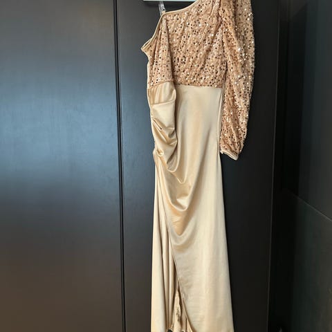 Kjolen er sydd opp og tyllet har noen skjønnhetsfeil i form av litt ulike lengder men det er ikke noe som legges merke til, men derfor leies den ut billig.
