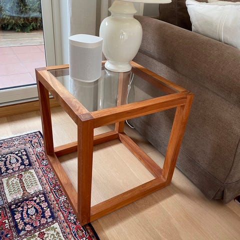 3 stk teak settbord i teak med glassplater. 45*45, H 45; 40*40, H 40; 35*35, H35.