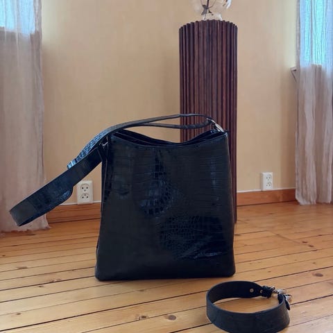 Becksöndergaard veske for dame i kunstlær. Vesken har preg som imiterer krokodilleskinn og er mørk brun med lys blå innside. Den har korte bærehåndtak og avtagbar, justerbar skulderrem. Innvendig er det flere rom,som gjør det enkelt å organisere innholdet. Bunnen har metallføtter som beskytter vesken når den settes ned. Passer til daglig bruk, jobb eller studier. Et par små merker, se bilde