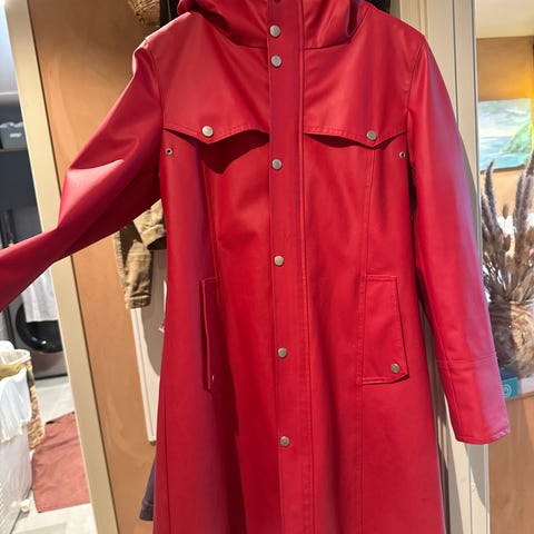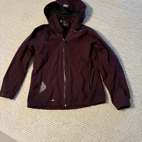 Helly Hansen regnjakke for dame i størrelse M. Jakken er rød og har hette med snøring. Materialet er vannavvisende og egnet som regntøy til hverdagsbruk og utendørsaktiviteter. HH-logo på hetten bak. Har noen rifter som vist på bildene. Selges ikke lengre.