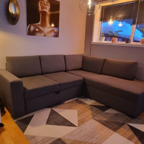 Bunnplaten er skadet etter tidligere flytting, derfor billigkroken. Skaden har ingen betydning for bruk og synes ikke. En kan fortsatt bruke bunden til å lagre dyner/puter som tiltenkt.