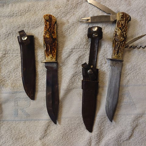 Flott kniv med damaskblad til variert bruk. Ypperlig til jakt. Robust lærslire med lås. Skaft av tre med nagler. Total lengde på kniv og skaft: 20 cm.