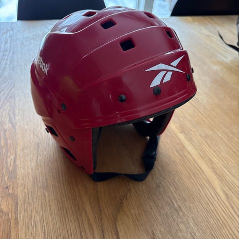 Reebok ishockeyhjelm med avtagbart gitter i metall, hvit farge. Hjelmen har justerbare stropper og polstret innside til bruk i ishockey.