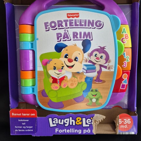 Fisher-Price Laugh & Learn "Fortelling på rim" er en interaktiv aktivitetsbok for små barn. Boken har sider som kan blaes, med illustrasjoner av figurer og enkle rim. Produktet har knapper på siden som aktiverer lyd og musikk, blant annet seks ulike sanger. Barnet kan trykke på knapper med bokstaver, tall og farger for å høre ord og lyder. Aktivitetsboken er laget for tidlig læring og lek, og passer for små barn innenfor aldersintervallet som er angitt på emballasjen (6–36 måneder).
