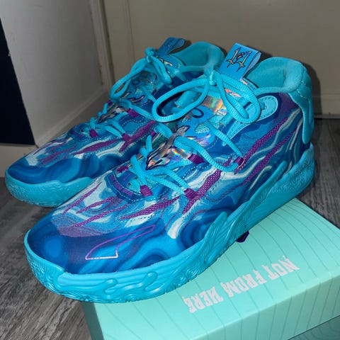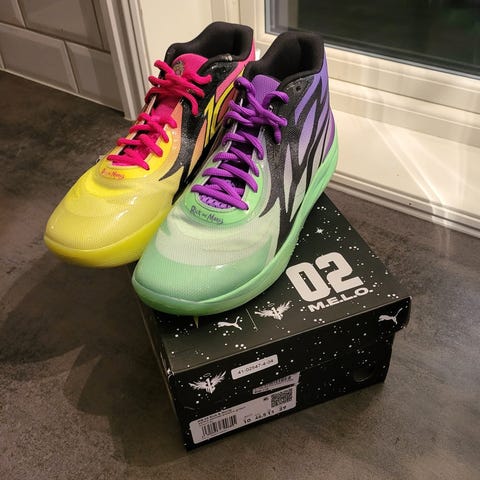 Puma MB.02 Rick and Morty basketsko i flerfarget design. Modellen har en høy ankelkonstruksjon med polstret krage og pløse for støtte rundt ankelen. Overdelen er i syntetisk materiale med grafiske detaljer og sterke kontrastfarger på hver sko. Yttersålen er i gummi med mønster som gir grep på innendørs underlag. Skoene leveres i original eske med tilhørende grafikk fra Rick and Morty-serien. Egnet som basketsko, jeg har selv brukt dem et par treninger og var ekstremt fornøyd med skoen, eneste problemet er at de var litt for små for min del.