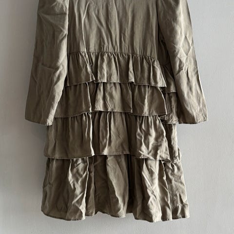 Zara hverdagskjole for dame i størrelse XS. Kjolen er ermeløs og i grå farge, laget i polyester og 5% elastin. Den har rund hals, innsvinget midje og kneppet/åpning bak. Skjørtedelen har en rett fasong med legg foran, og det er lommer i sidene. Egner seg til hverdagsbruk og enkle, pene anledninger.