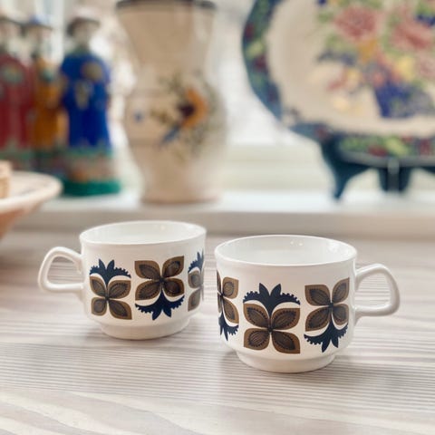 kopper krus retro vintage 60 70 tall grafisk blomsterdekor botanisk hytte fjellhytte tekopp kopper keramikk fajanse 15