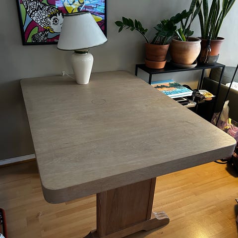 Bordet har vanlige bruksmerker i platen, men ikke store stygge merker. Det ene bordbeinet er blitt limt en gang, men dette har aldri vært noe problem i mitt eie. Kom gjerne med bud!