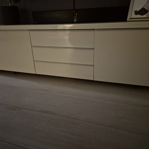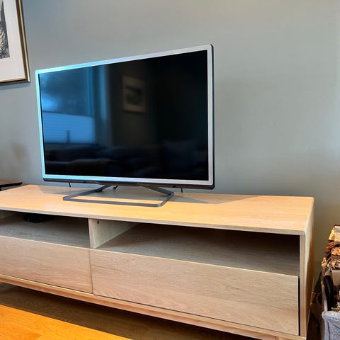 TV-benk fra IKEA. 3 hyllerom hvor hyllen til venstre har en planke i midten, og de to andre rommene er tomme. Farge: lys eik