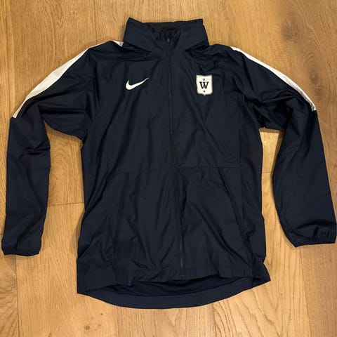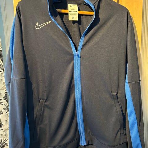 Nike fotballjakke for herre i størrelse S. Jakken er blå med hvite detaljer og hel glidelås i front. Langermet modell med klubb- eller laglogo på brystet og Nike-logo på motsatt side. Egnet som overtrekksjakke eller treningsjakke til fotball og annen fysisk aktivitet.
