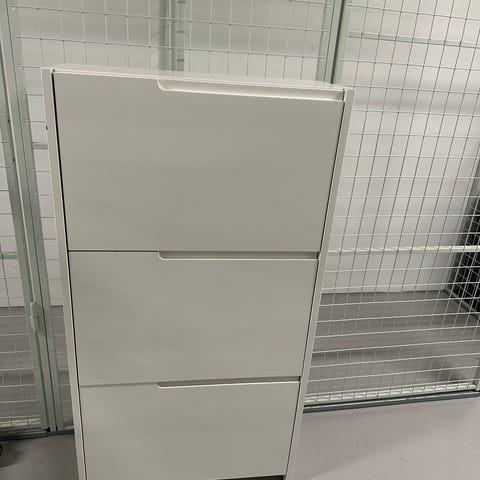 IKEA skoskap med fire seksjoner. Skapet er høyt og smalt, med fire separate klaffer for oppbevaring av sko. Overflate i lyst treverk med runde knotter på hver klaff. Egnet til plassbesparende oppbevaring av sko i gang eller entré.