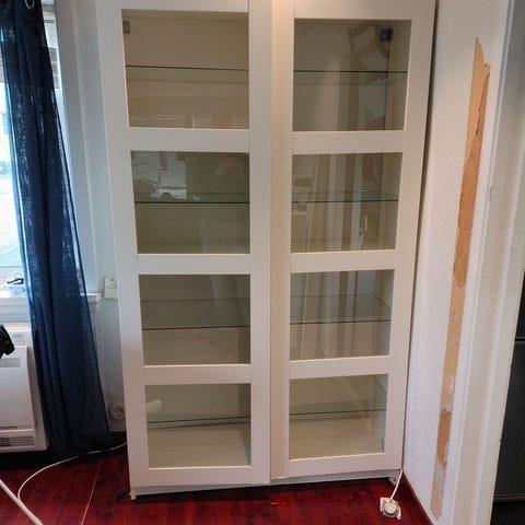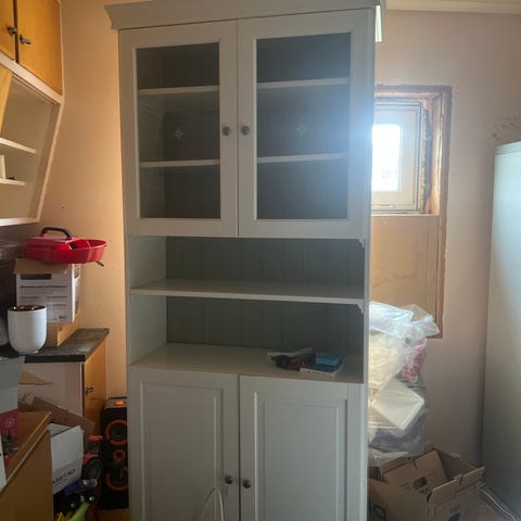 Skittent og støvete, stygt malt og godt brukt. Har vært i bruk som det er, men trenger masse kjærlighet og kanskje noen spiker for å bli et godt møbel igjen. Det mangler en hylleplate. Skapet står på små hjul, de opprinnelige føttene er forsvunnet Magnetlåsen på dørene fungerer sånn passe. Ukjent merke. Antatt finer/furu? Oppgitte mål er omtrentlige og kan være pluss/minus noen cm.