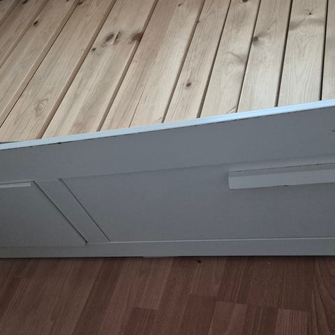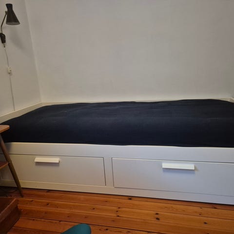 IKEA dagseng i grå. Under sengen er det 3 romslige skuffer til ekstra oppbevaringsplass. Kan dras ut til dobbelseng. Madrassene følger med.