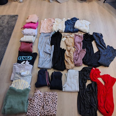 Klespakke som inneholder fem kjoler, en bukse, en pysj(jul), fem tynnere gensere, seks tykkere gensere, heldress i 50% ull, body i 100% ull.