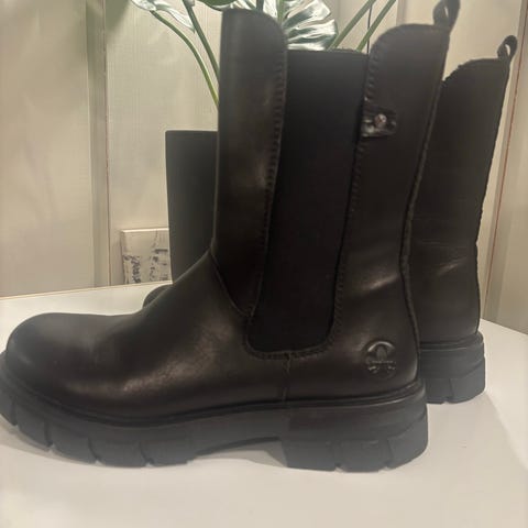 Ganni støvler i størrelse 41. Modellen er ankelhøy med kraftig såle og drahemper foran og bak. Støvlene er i svart materiale med avrundet tupp og elastiske felt i sidene for enklere av- og påkledning. Passer til hverdagsbruk i ulike værforhold.