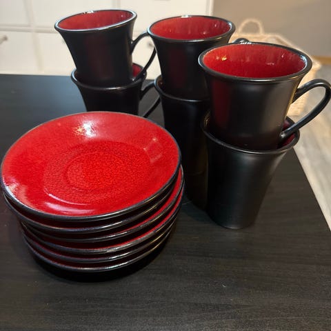 Selger 6 røde keramikkopper/skåler med tilhørende tallerkener. Klassisk og tidløst design, passer fint til kaffe, te eller suppe. Også fine som dekor eller til hyttebruk.