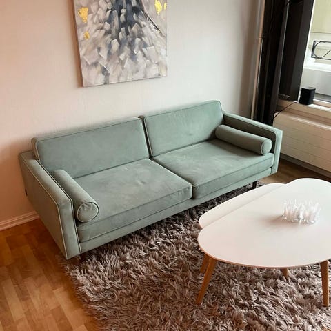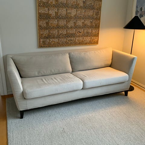 Har et lite merke med neglelakk som jeg ikke har turt prøve å fjerne, men som er helt i innerste hjørne på sitteputen og derfor ikke er synlig når man har puter i sofaen. Ellers i veldig god stand og nyrenset.
