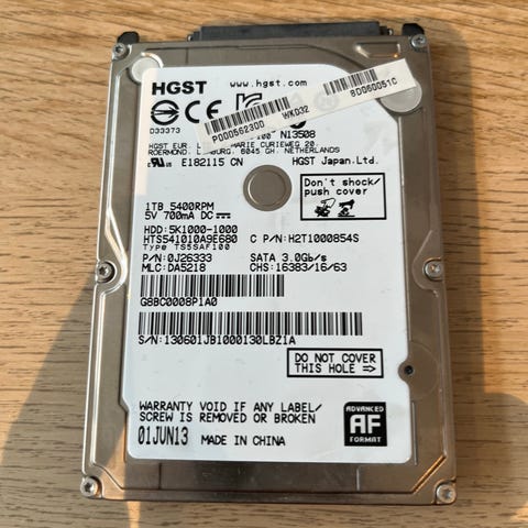 HGST Z7K1000 harddisk, 2,5" med kapasitet på 1TB. Rotasjonshastighet 7200rpm. Se også mine andre annonser :)