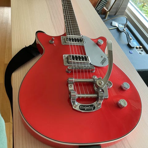 Gretsch Electromatic elektrisk gitar i svart finish. Kroppen har enkelt cutaway-design og er utstyrt med to single-coil-pickuper. Gitaren har Bigsby-vibratosystem, treveis pickup-bryter og separate kontrollere for volum og tone. Rosewood gripebrett med båndmarkeringer og krom hardware. Leveres med formtilpasset koffert som vist på bildene.