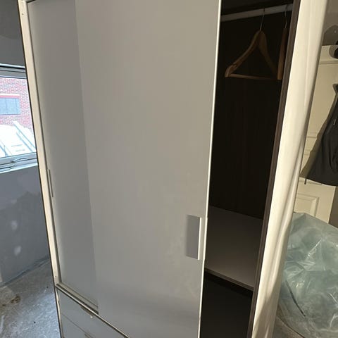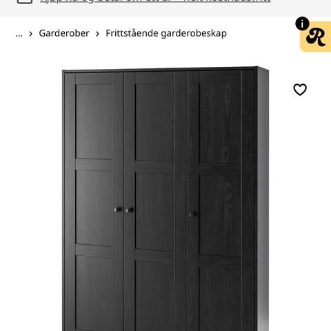 IKEA garderobeskap i svart utførelse. Skapet har to dører med enkle håndtak. Innvendig er det en klesstang til oppheng av klær og åpne hyller nederst som gir plass til brettede klær eller oppbevaringsbokser. Passer til soverom, gang eller annet rom der det er behov for klesoppbevaring. Kjøpt nytt sommeren 2025.