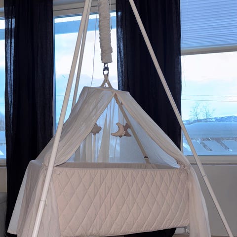 Fint brukt moonboon med FLAT bunn så babyen kan sove der heile natta. Motor som lager låg lyd.