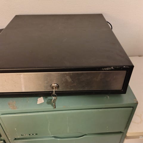Brukt kasseskuff med synlige bruksmerker og riper i overflaten. Ingen tydelige strukturelle skader observert. Ikke funksjonstestet, antas å fungere – kjøper kan returnere hvis den ikke gjør det. Nøkkel er synlig på bildene.