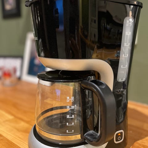 Kaffetrakteren har en gjennomsiktig glasskanne med håndtak i plast og base i rustfritt stål. Lokket på trakteren kan åpnes for enkel tilgang til filterholder og vannbeholder. På fronten er det et lite betjeningspanel med knapper og display.