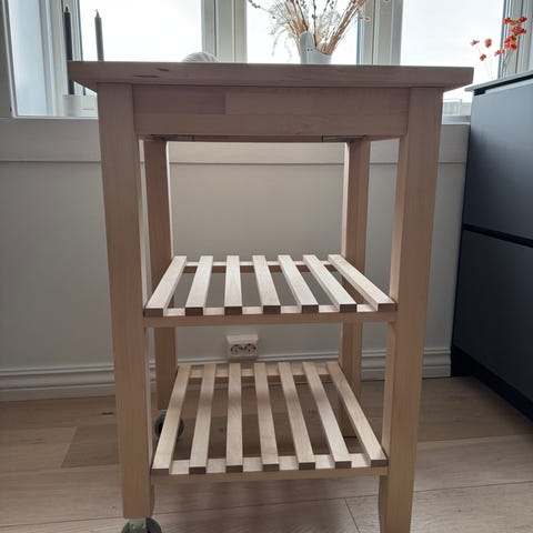 Flyttbart trancher bord med to hjul under på den ene siden. Gir ekstra oppbevaringsplass på kjøkkenet med f.eks. vinflasker under.