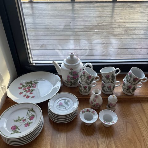 Selger et pent brukt servise fra Porsgrund Porselænsfabrik, dekor Summer Strawberries. Klassisk jordbærmotiv, produsert i England, dekorert for Porsgrund. Tidløst og hyggelig servise som passer godt til både hverdagsbruk, hytte eller samlere.