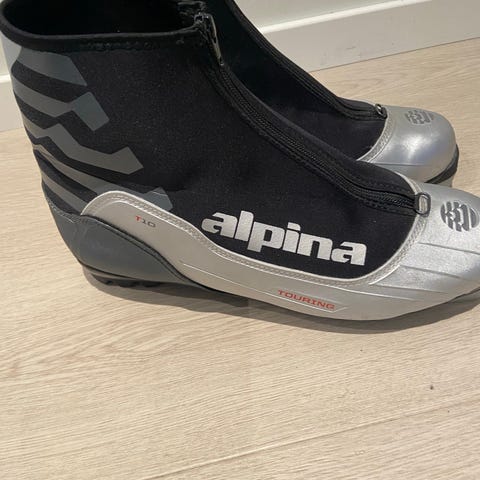 Alpina Touring langrennsstøvler i svart farge. Modellen har glidelås i front og overtrekk som beskytter mot snø og fukt. Overdelen er laget i syntetisk materiale med forsterkninger rundt tå og hæl. Sålen er tilpasset klassisk langrenn med kompatibelt bindingssystem (se nærbilder for detalj). Støvlene har polstret innside for økt komfort og støtte rundt ankelen. Egner seg til tur- og rekreasjonslangrenn.