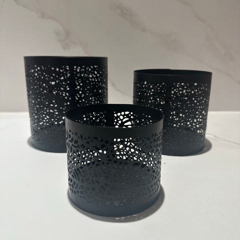 Skeidar lyslyktsett på stativ i metall i gullfarge. Settet består av tre runde lykter i ulik høyde med stativ og åpen trådkonstruksjon. Hver lykt har en holder til telys eller liten lyspære i midten. Passer til bruk som dekorasjon på gulv i stue, gang eller andre oppholdsrom innendørs. Designet gir godt innsyn til lyset og et markert skygge- og lysspill rundt lyktene.