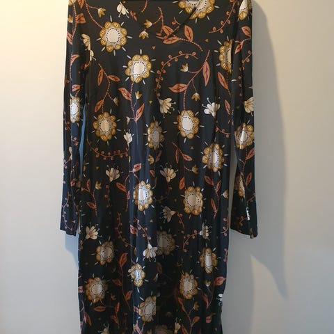 Stripete kjole med fine detaljer fra Gudrun Sjødén i 100% organisk bomull. Kontraststriper inni ermene og i sidene ved lommene som gir fint stripespill. Knelang til meg på 162 cm. Brukt minimalt, fremstår som ny.