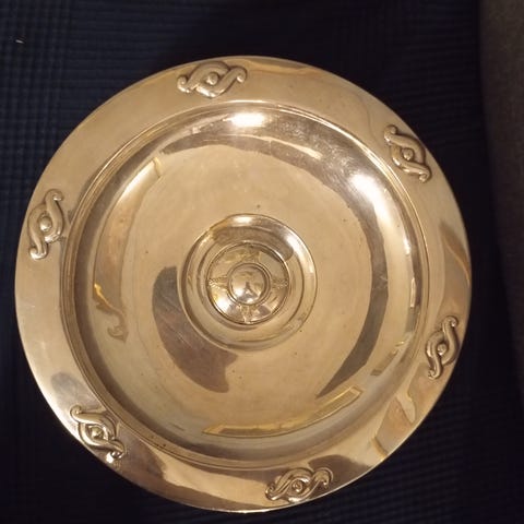 Tinnkrus med lokk og tinnfat selges samlet