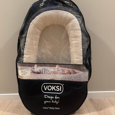 Voksi babynest i hvit farge. Babynestet har polstret bunn og myke, høye kanter som gir en avgrenset liggeflate for baby. Det har bærehåndtak på sidene og justerbar åpning i fotenden. Passer til bruk i seng, sofa eller på gulv som en egen liggeplass for spedbarn. Trekket kan tas av for vask ifølge vaskeanvisning på produktet. Passer fra nyfødt til 3 mnd ca😊 Selges fordi babyen vår har vokst ut av det.