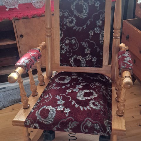 Eldre gyngestol selges. Bruksmerker og slitasje i lakken. Ene armlene har blitt reparert, se bilde.
