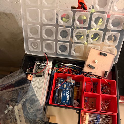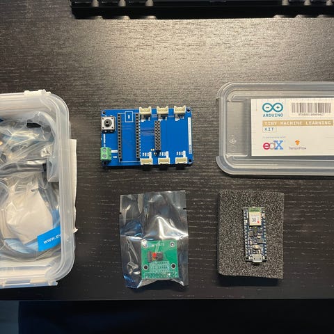 Arduino Starter Kit elektronikksett med Arduino Uno R3 mikrokontrollerkort. Settet inneholder blant annet Arduino Uno R3, breadboard, ledninger, motstander, lysdioder og ulike sensorer og komponenter for bygging av enkle elektronikk- og programmeringsprosjekter. Egnet for læring og prototyping innen elektronikk og mikrokontrollerprogrammering.