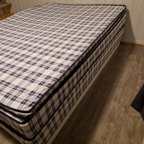 Jysk kontinentalseng i grått tekstiltrekk. Sengen består av understell med madrass.
