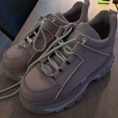 Buffalo Sneakers joggesko i størrelse 40. Skoene har en tykk såle og er i en lys farge. Designet er robust med snøring og detaljer på sidene. Egnet for hverdagsbruk eller til 90-tallsfesten.