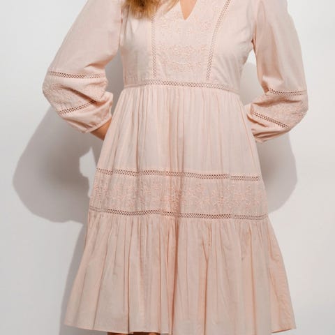H&M hverdagskjole for dame i størrelse XS. Kjolen er beige med mønster og laget i viskose. Den har lange ermer, v-utringning med liten åpning foran og løs passform med lett utsvinget skjørt. Egnet som hverdagskjole.