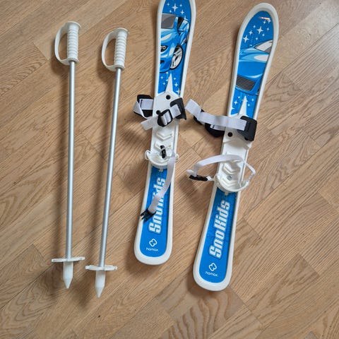 Barneski med justerbar binding som passer flere skostørrelser. Ski og staver, passer for de minste barna. Lengde ski 70 cm.