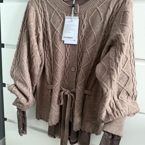 Co’couture cardigan for dame i størrelse S. Strikket i brun ull med flettestruktur og mønsterstrikk foran og på ermene. Modellen har rund hals, knappelukking i front og knytebelte i livet. Ribbestrikkede mansjetter og kant nederst. Passer til hverdagsbruk og som et ekstra lag på kjølige dager.