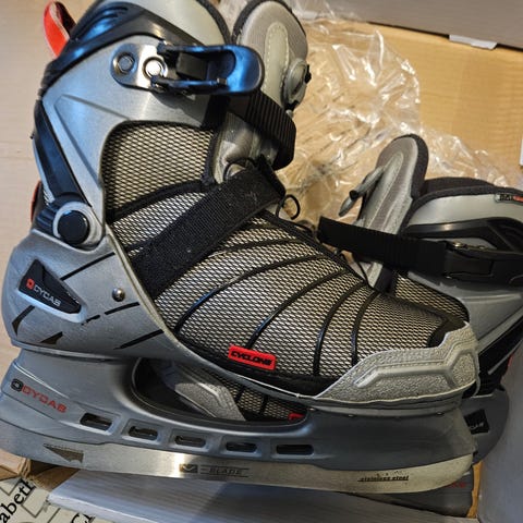 Cycab skøyter i størrelse 41. Skøytene har snøring foran og hæl med støtte for ankelen. Overdelen er i syntetisk materiale med polstret innside for økt komfort. Egner seg til generell skøytebruk på isbaner og lignende.